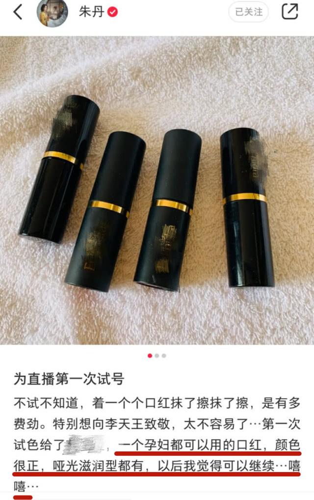 朱丹还分享了两张亲自为大家试色的照片,不知道是不是私底下很少化妆,朱丹试色过程中有好几种口红都涂过界了,莫名有些可爱呢有木有!所以朱丹还直呼想向李天王致敬,并感慨太不容易了,简直实力演绎了一个不会化妆的女明星向男网红诉苦的画面。