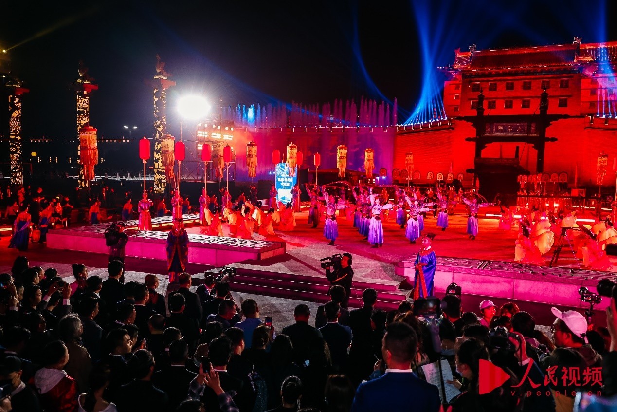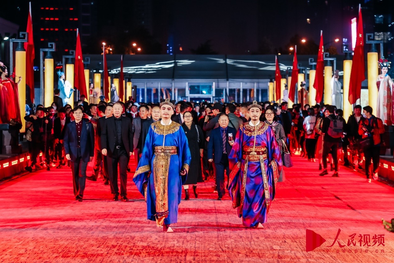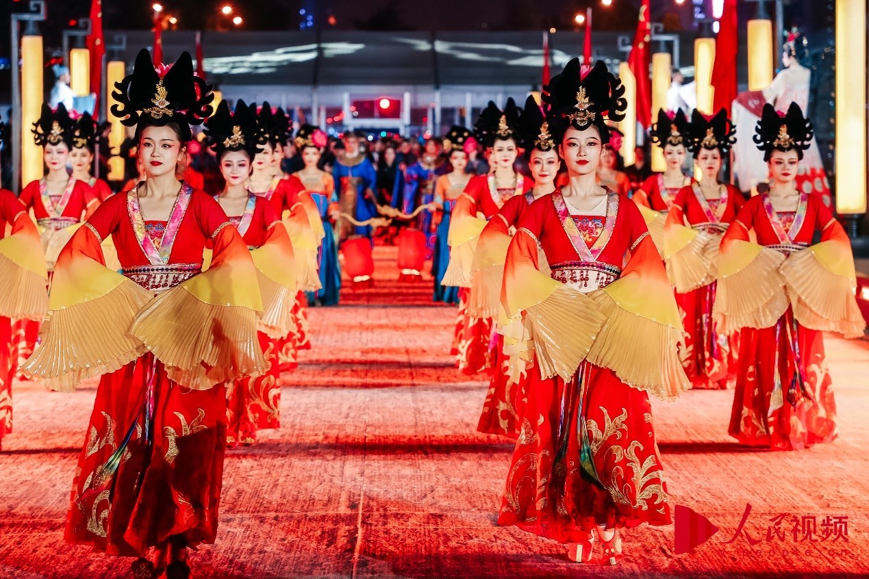 丝路连接世界,电影和合文明,万里而来,唯国礼相待。古丝绸之路起点之城西安,古城墙永宁门外吊桥轻落,城门大开,大唐仕女、金甲武士鱼贯而出,鸿胪寺卿执盛唐国礼,为电影节嘉宾授礼。流光溢彩的瓮城之内,一曲《丝路霓裳》凝练着丝绸之路沿线的风情与魅力华彩登场,展现着两千多年来从长安到罗马的丝路文明。象征“一带一路”沿线国家友谊的“鸾凤”从场内起飞,寓意丝绸之路沿线国家和谐相处、美美与共,共同庆贺本届“丝路国际电影节”开幕,突出人类命运共同体理念。