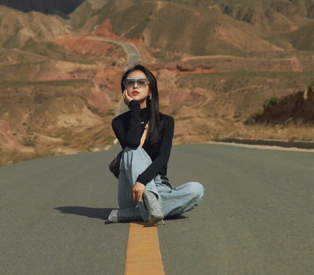 照片中的她身穿紧身黑色毛衣,脚踩尖头镶钻高跟鞋,戴着镶钻墨镜,表情冷酷地坐在空旷的马路中间摆pose拍照。