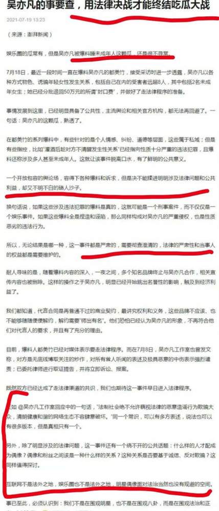 此前,《澎湃新闻》就发表过一篇娱乐评论表示,吴亦凡事件的瓜,最终的解决应该交给法律,要相信法律会给出一个公允的判决。