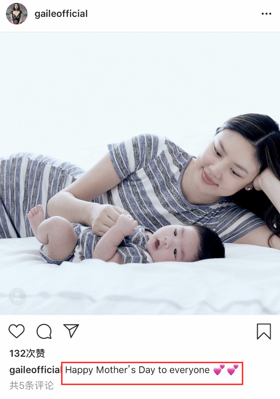 5月10日乐基儿晒出母子同框照庆祝母亲节,乐基儿和儿子Hunter都穿着蓝黑白三色条纹衣,母子同框仿若复制粘贴,照片是Hunter刚出生不久拍的,乐基儿和儿子躺在床上,乐基儿深情款款看着Hunter,手抓宝宝的小手,Hunter大眼萌化了。